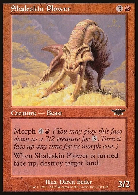Morph {4}{R} (You may cast this card face down as a 2/2 creature for {3}. Turn it face up any time for its morph cost.) When Shaleskin Plower is turned face up, destroy target land.