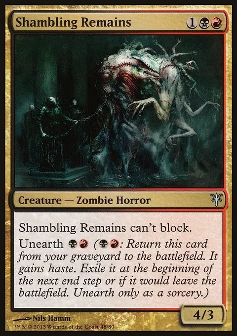 Shambling Remains can't block. Unearth {B}{R} ({B}{R}: Return this card from your graveyard to the battlefield. It gains haste. Exile it at the beginning of the next end step or if it would leave the battlefield. Unearth only as a sorcery.)