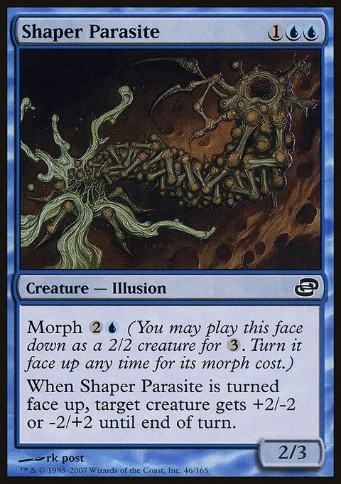 Morph {2}{U} (You may cast this card face down as a 2/2 creature for {3}. Turn it face up any time for its morph cost.) When Shaper Parasite is turned face up, target creature gets +2/-2 or -2/+2 until end of turn.