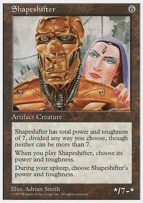 Shapeshifter has total power and toughness of 7, divided any way you choose, though neither can be more than 7. When you play Shapeshifter, choose its power and toughness. During your upkeep, choose Shapeshifter’s power and toughness.