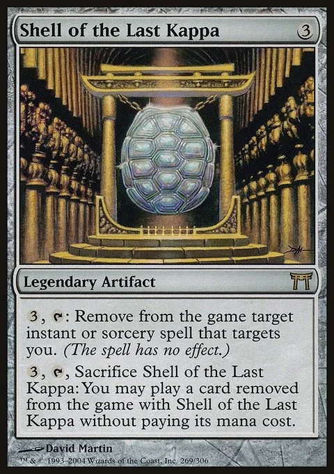 {3}, {T}: Exile target instant or sorcery spell that targets you. (The spell has no effect.) {3}, {T}, Sacrifice Shell of the Last Kappa: You may cast a spell from among cards exiled with Shell of the Last Kappa without paying its mana cost.