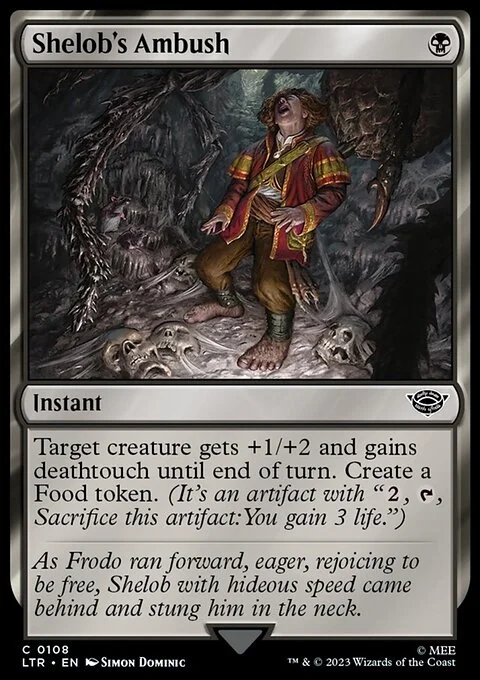 Target creature gets +1/+2 and gains deathtouch until end of turn. Create a Food token. (It's an artifact with "{2}, {T}, Sacrifice this token: You gain 3 life.")