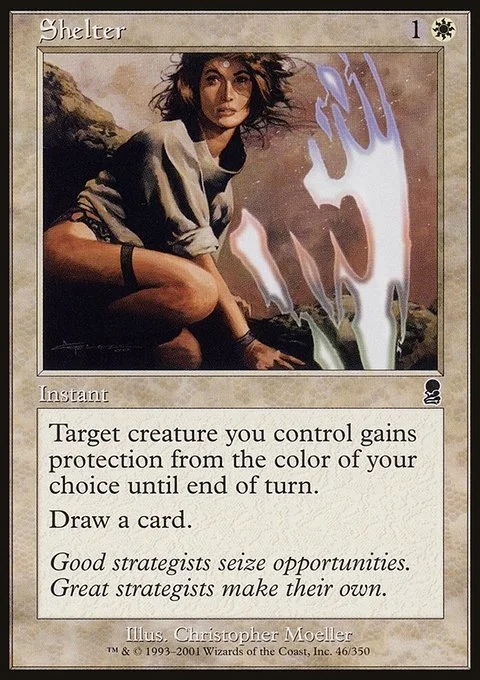 Target creature you control gains protection from the color of your choice until end of turn. Draw a card.
