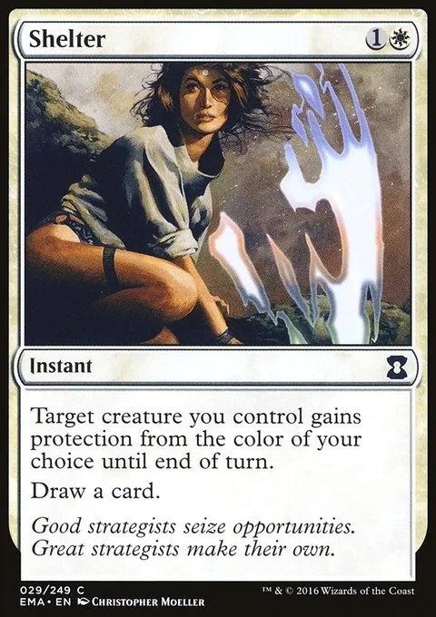 Target creature you control gains protection from the color of your choice until end of turn. Draw a card.