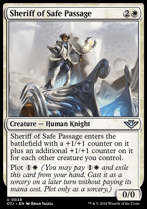 Sheriff of Safe Passage enters the battlefield with a +1/+1 counter on it plus an additional +1/+1 counter on it for each other creature you control.