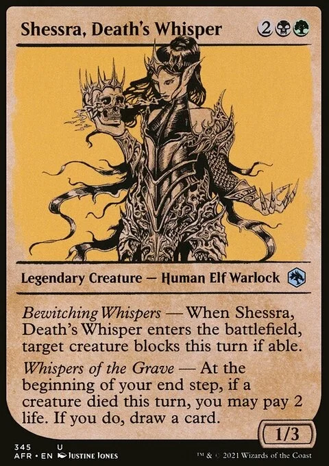 Bewitching Whispers — When Shessra, Death's Whisper enters the battlefield, target creature blocks this turn if able.
