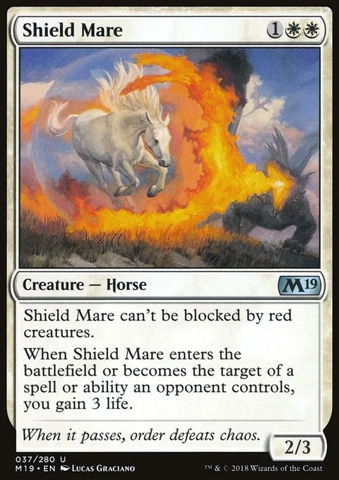 Shield Mare can't be blocked by red creatures. When Shield Mare enters the battlefield or becomes the target of a spell or ability an opponent controls, you gain 3 life.