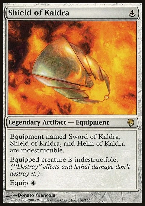 Equipment named Sword of Kaldra, Shield of Kaldra, and Helm of Kaldra have indestructible. Equipped creature has indestructible. (Damage and effects that say "destroy" don't destroy it.) Equip {4}