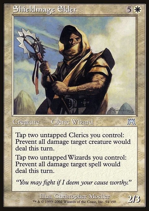 Tap two untapped Clerics you control: Prevent all damage target creature would deal this turn. Tap two untapped Wizards you control: Prevent all damage target spell would deal this turn.