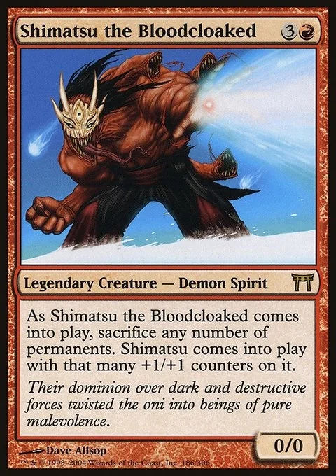 As Shimatsu the Bloodcloaked enters the battlefield, sacrifice any number of permanents. Shimatsu enters the battlefield with that many +1/+1 counters on it.
