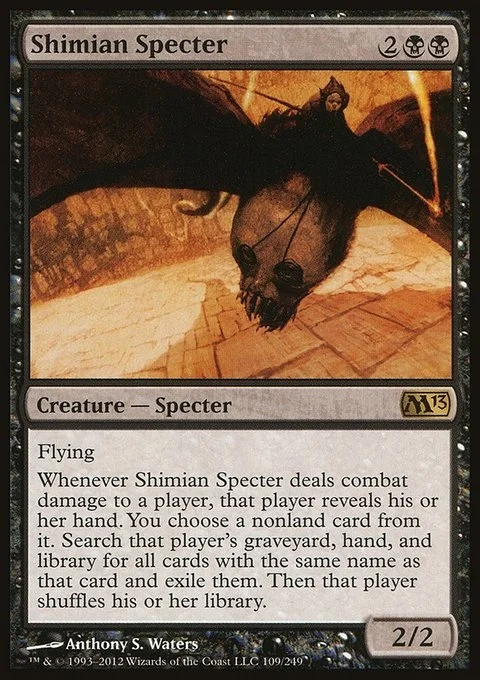 Whenever Shimian Specter deals combat damage to a player, that player reveals their hand. You choose a nonland card from it. Search that player's graveyard, hand, and library for all cards with the same name as that card and exile them. Then that player shuffles their library.