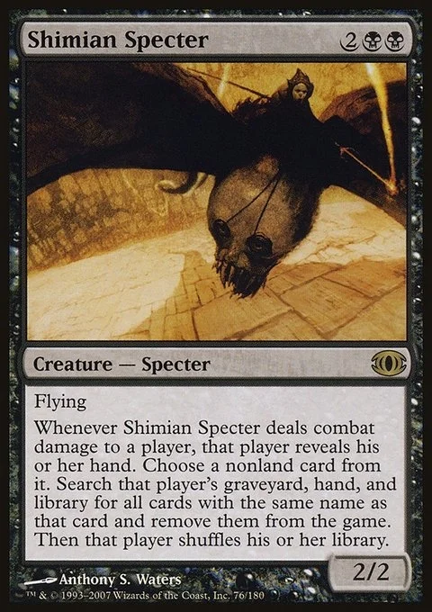 Whenever Shimian Specter deals combat damage to a player, that player reveals his or her hand. Choose a nonland card from it. Search that player's graveyard, hand, and library for all cards with the same name as that card and remove them from the game. Then that player shuffles his or her library.