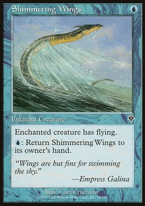 Enchant creature (Target a creature as you cast this. This card enters the battlefield attached to that creature.) Enchanted creature has flying. (It can't be blocked except by creatures with flying or reach.) {U}: Return Shimmering Wings to its owner's hand.