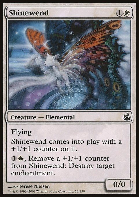 Flying Shinewend enters with a +1/+1 counter on it. {1}{W}, Remove a +1/+1 counter from Shinewend: Destroy target enchantment.