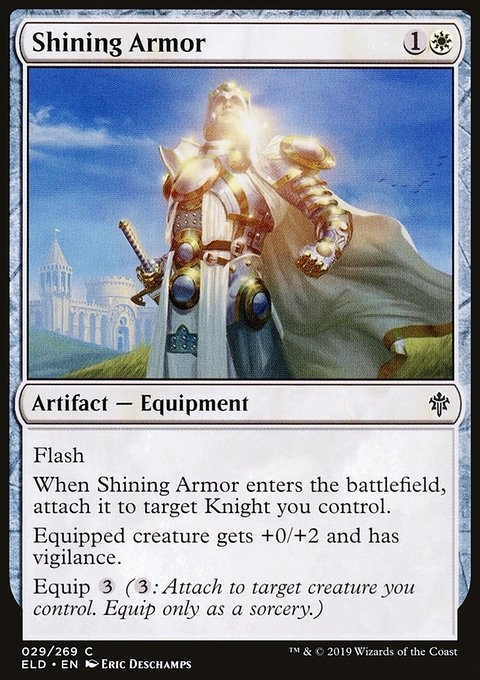 Flash When Shining Armor enters the battlefield, attach it to target Knight you control. Equipped creature gets +0/+2 and has vigilance. Equip {3} ({3}: Attach to target creature you control. Equip only as a sorcery.)