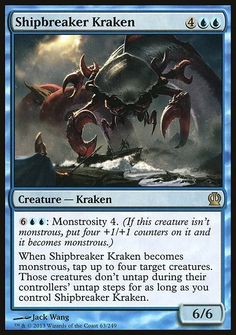 When Shipbreaker Kraken becomes monstrous, tap up to four target creatures. Those creatures don't untap during their controllers' untap steps for as long as you control Shipbreaker Kraken.