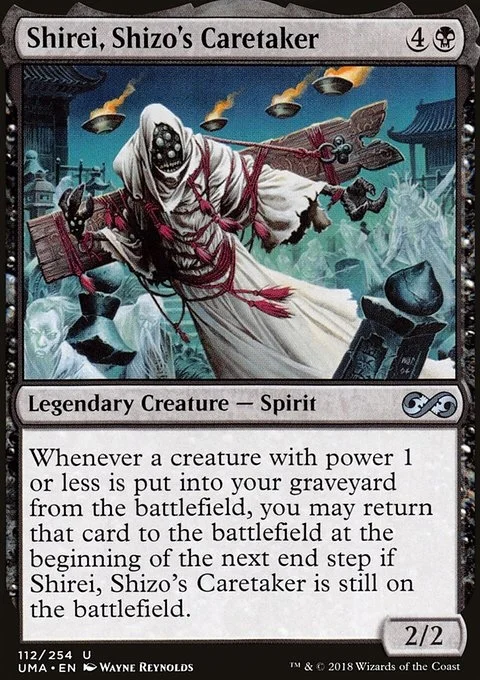 Whenever a creature with power 1 or less is put into your graveyard from the battlefield, you may return that card to the battlefield at the beginning of the next end step if Shirei, Shizo's Caretaker is still on the battlefield.