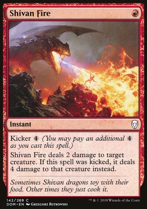 Kicker {4} (You may pay an additional {4} as you cast this spell.) Shivan Fire deals 2 damage to target creature. If this spell was kicked, it deals 4 damage instead.