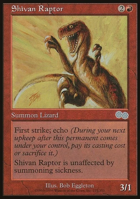 First strike; echo (During your next upkeep after this permanent comes under your control, pay its casting cost or sacrifice it.) Shivan Raptor is unaffected by summoning sickness.