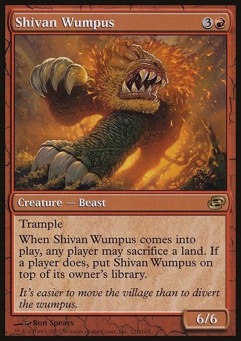 Trample When Shivan Wumpus enters the battlefield, any player may sacrifice a land. If a player does, put Shivan Wumpus on top of its owner's library.