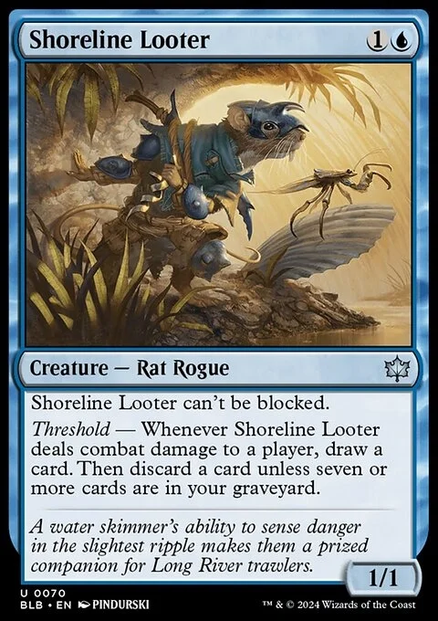 Shoreline Looter can't be blocked. Threshold — Whenever Shoreline Looter deals combat damage to a player, draw a card. Then discard a card unless seven or more cards are in your graveyard.