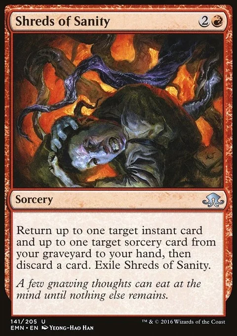 Return up to one target instant card and up to one target sorcery card from your graveyard to your hand, then discard a card. Exile Shreds of Sanity.