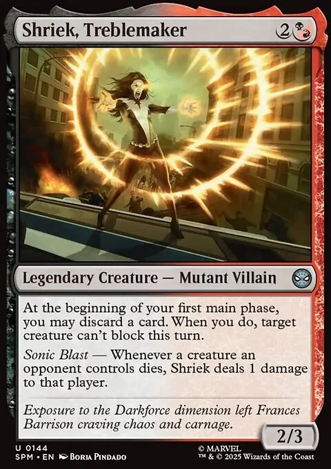 At the beginning of your first main phase, you may discard a card. When you do, target creature can't block this turn. Sonic Blast — Whenever a creature an opponent controls dies, Shriek deals 1 damage to that player.
