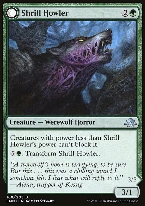Shrill Howler Creatures with power less than Shrill Howler's power can't block it. {5}{G}: Transform Shrill Howler. Howling Chorus Creatures with power less than Howling Chorus's power can't block it. Whenever Howling Chorus deals combat damage to a player, create a 3/2 colorless Eldrazi Horror creature token.