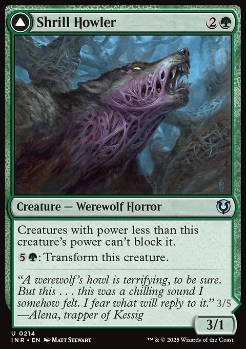 Shrill Howler Creatures with power less than Shrill Howler's power can't block it. {5}{G}: Transform Shrill Howler. Howling Chorus Creatures with power less than Howling Chorus's power can't block it. Whenever Howling Chorus deals combat damage to a player, create a 3/2 colorless Eldrazi Horror creature token.