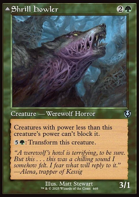 Shrill Howler Creatures with power less than this creature's power can't block it. {5}{G}: Transform this creature. Howling Chorus Creatures with power less than this creature's power can't block it. Whenever this creature deals combat damage to a player, create a 3/2 colorless Eldrazi Horror creature token.