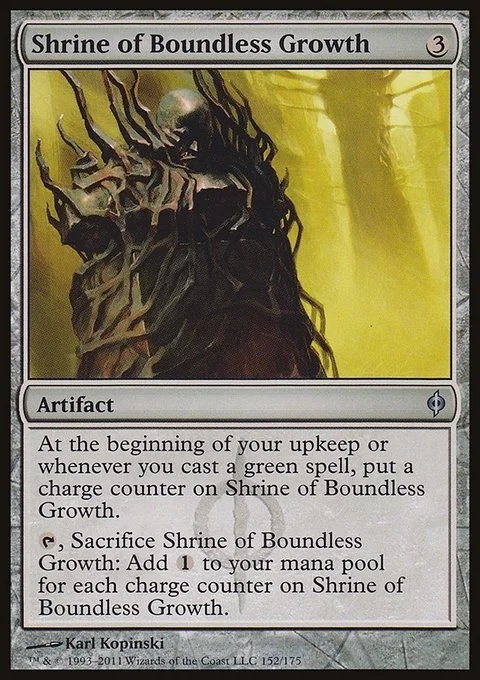 At the beginning of your upkeep or whenever you cast a green spell, put a charge counter on Shrine of Boundless Growth.