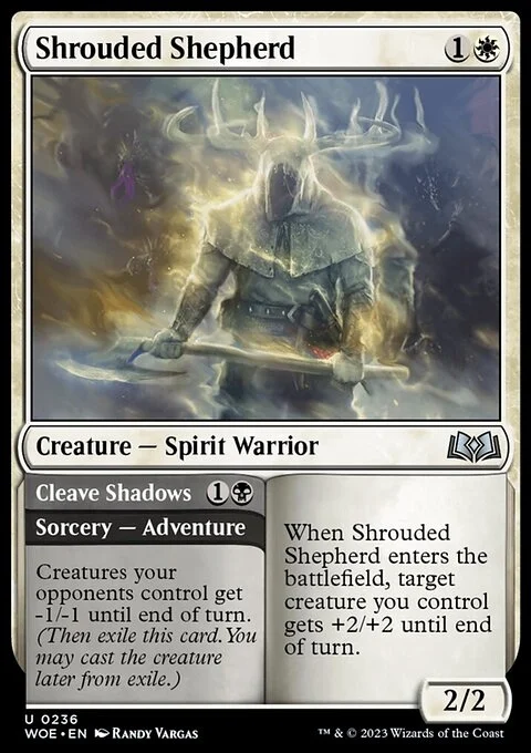 Shrouded Shepherd When Shrouded Shepherd enters the battlefield, target creature you control gets +2/+2 until end of turn. Cleave Shadows Creatures your opponents control get -1/-1 until end of turn. (Then exile this card. You may cast the creature later from exile.)
