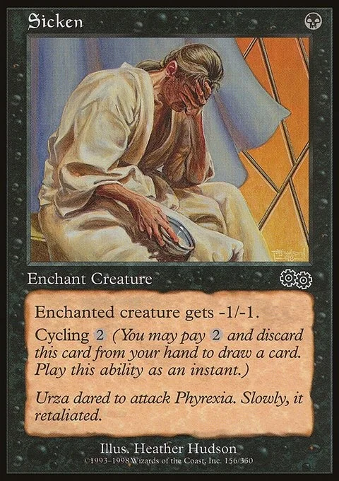 Enchant creature Enchanted creature gets -1/-1. Cycling {2} ({2}, Discard this card: Draw a card.)