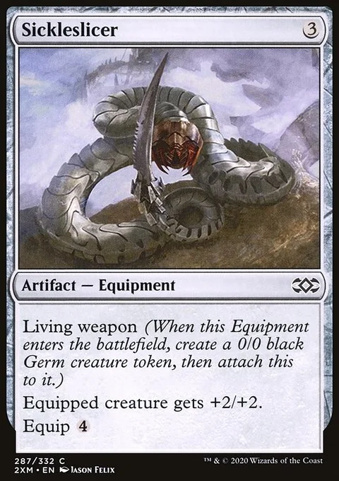 Living weapon (When this Equipment enters the battlefield, create a 0/0 black Germ creature token, then attach this to it.) Equipped creature gets +2/+2. Equip {4}