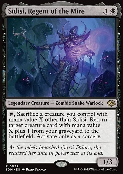 {T}, Sacrifice a creature you control with mana value X other than Sidisi: Return target creature card with mana value X plus 1 from your graveyard to the battlefield. Activate only as a sorcery.