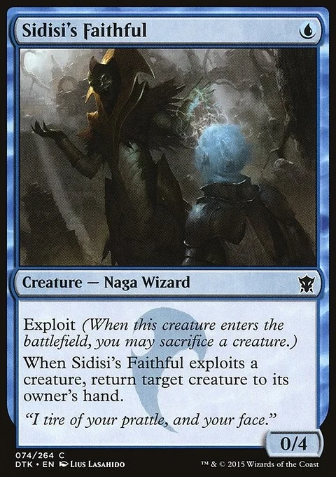 Exploit (When this creature enters the battlefield, you may sacrifice a creature.) When Sidisi's Faithful exploits a creature, return target creature to its owner's hand.