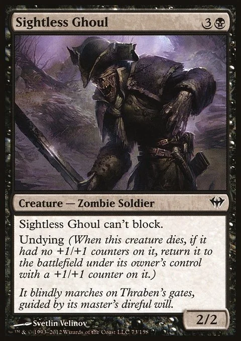Sightless Ghoul can't block. Undying (When this creature dies, if it had no +1/+1 counters on it, return it to the battlefield under its owner's control with a +1/+1 counter on it.)