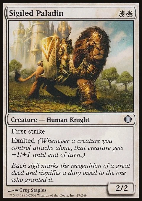 First strike Exalted (Whenever a creature you control attacks alone, that creature gets +1/+1 until end of turn.)
