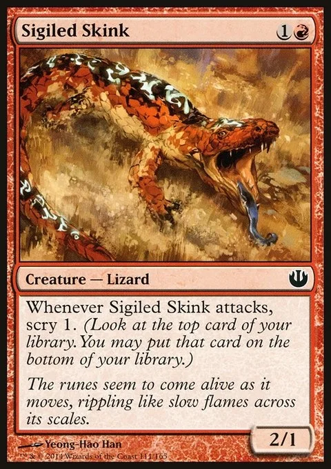 Whenever Sigiled Skink attacks, scry 1. (Look at the top card of your library. You may put that card on the bottom of your library.)