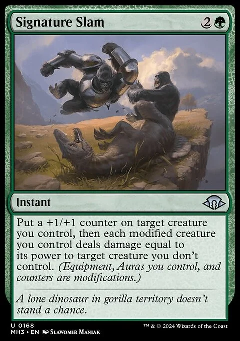 Put a +1/+1 counter on target creature you control, then each modified creature you control deals damage equal to its power to target creature you don't control. (Equipment, Auras you control, and counters are modifications.)