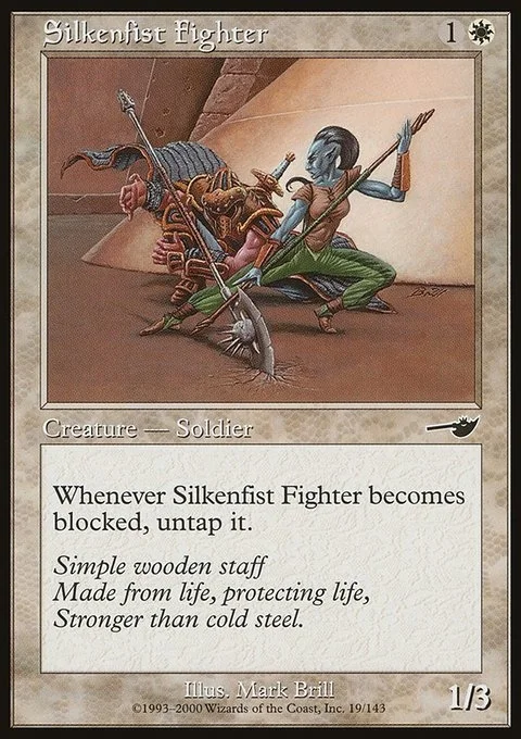 Whenever Silkenfist Fighter becomes blocked, untap it.