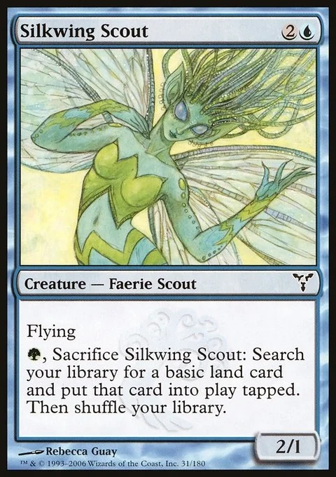Flying {G}, Sacrifice Silkwing Scout: Search your library for a basic land card, put that card onto the battlefield tapped, then shuffle.