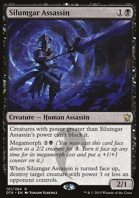 Creatures with power greater than Silumgar Assassin's power can't block it. Megamorph {2}{B} (You may cast this card face down as a 2/2 creature for {3}. Turn it face up any time for its megamorph cost and put a +1/+1 counter on it.) When Silumgar Assassin is turned face up, destroy target creature with power 3 or less an opponent controls.