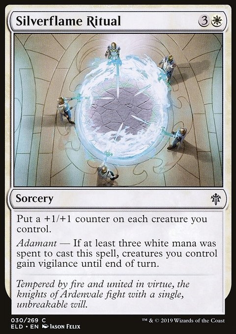 Put a +1/+1 counter on each creature you control. Adamant — If at least three white mana was spent to cast this spell, creatures you control gain vigilance until end of turn.