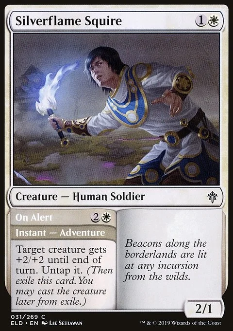 Silverflame Squire On Alert Target creature gets +2/+2 until end of turn. Untap it. (Then exile this card. You may cast the creature later from exile.)