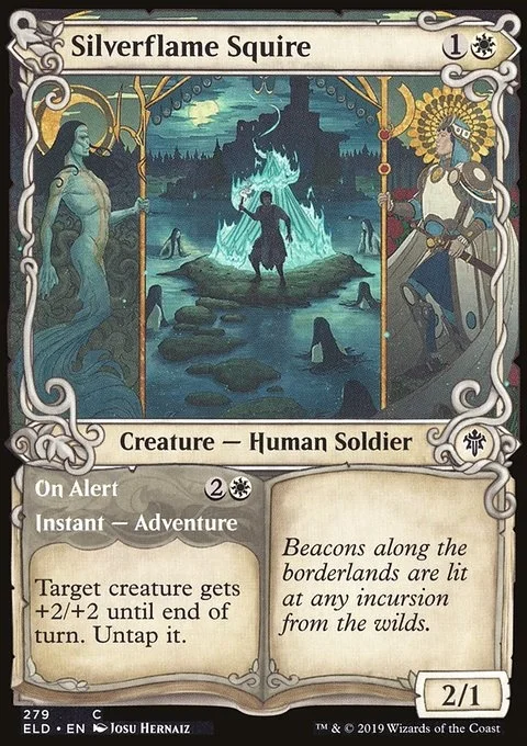 Silverflame Squire On Alert Target creature gets +2/+2 until end of turn. Untap it. (Then exile this card. You may cast the creature later from exile.)
