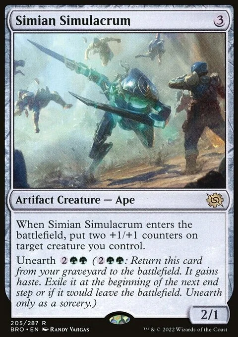 When Simian Simulacrum enters the battlefield, put two +1/+1 counters on target creature you control. Unearth {2}{G}{G} ({2}{G}{G}: Return this card from your graveyard to the battlefield. It gains haste. Exile it at the beginning of the next end step or if it would leave the battlefield. Unearth only as a sorcery.)