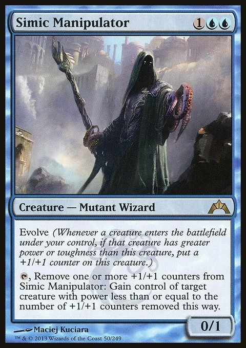 {T}, Remove one or more +1/+1 counters from Simic Manipulator: Gain control of target creature with power less than or equal to the number of +1/+1 counters removed this way.
