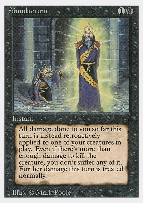 All damage done to you so far this turn is instead retroactively applied to one of your creatures in play. Even if there’s more than enough damage to kill the creature, you don’t suffer any of it. Further damage this turn is treated normally.
