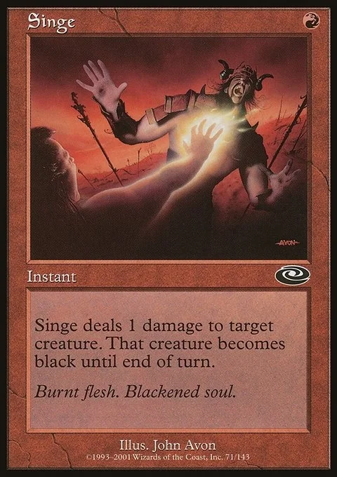 Singe deals 1 damage to target creature. That creature becomes black until end of turn.